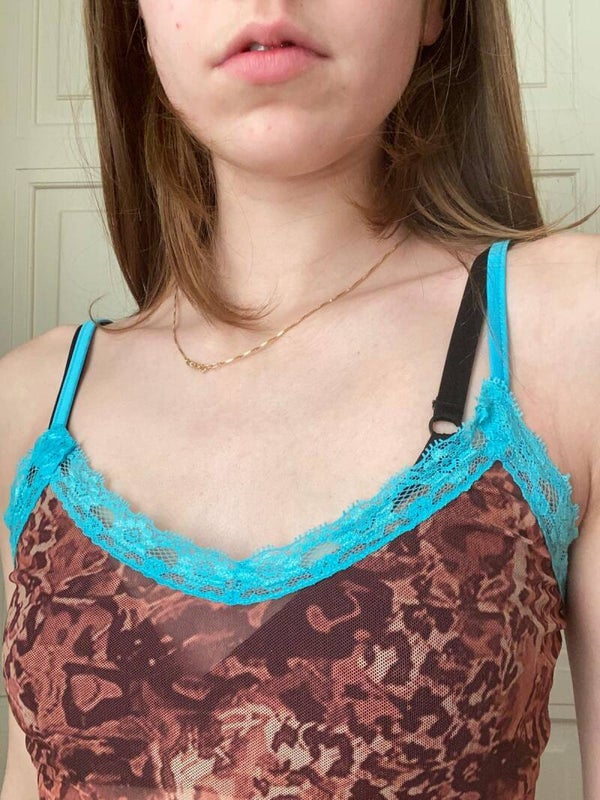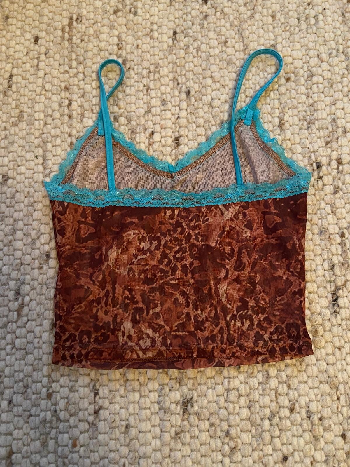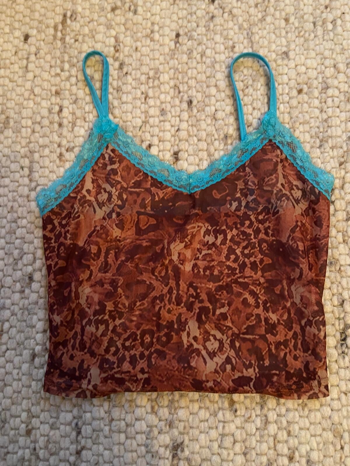 Tank top with orange-brown leopard print and blue lace, a bit see-through (see pictures). In very good condition, rarely worn. Purchased at a flea market in Switzerland.