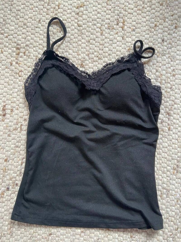 Black tank top with lace details. With pads and adjustable straps. In good condition, little to no signs of usage. Bought on a flea market in Switzerland.