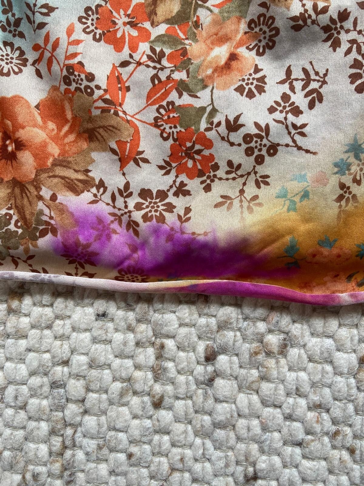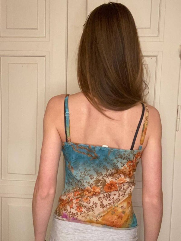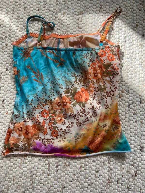 Top with orange lace detail, flower pattern and adjustable straps. In good condition, rarely worn but has a pink stain on the back (see pictures). Bought on a flea market in Switzerland.