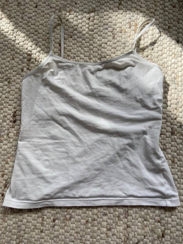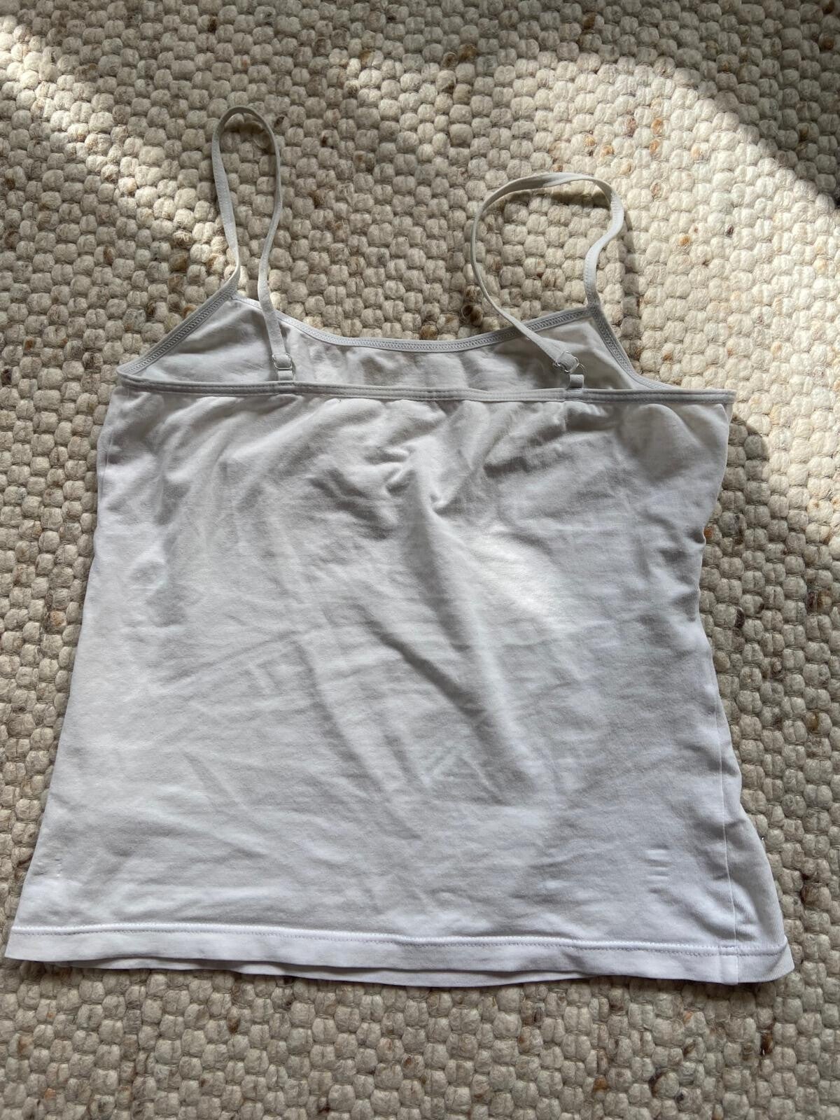 Basic white tank top with adjustable straps, slightly transparent. Already worn but still in good condition. Bought on a flea market in Switzerland.