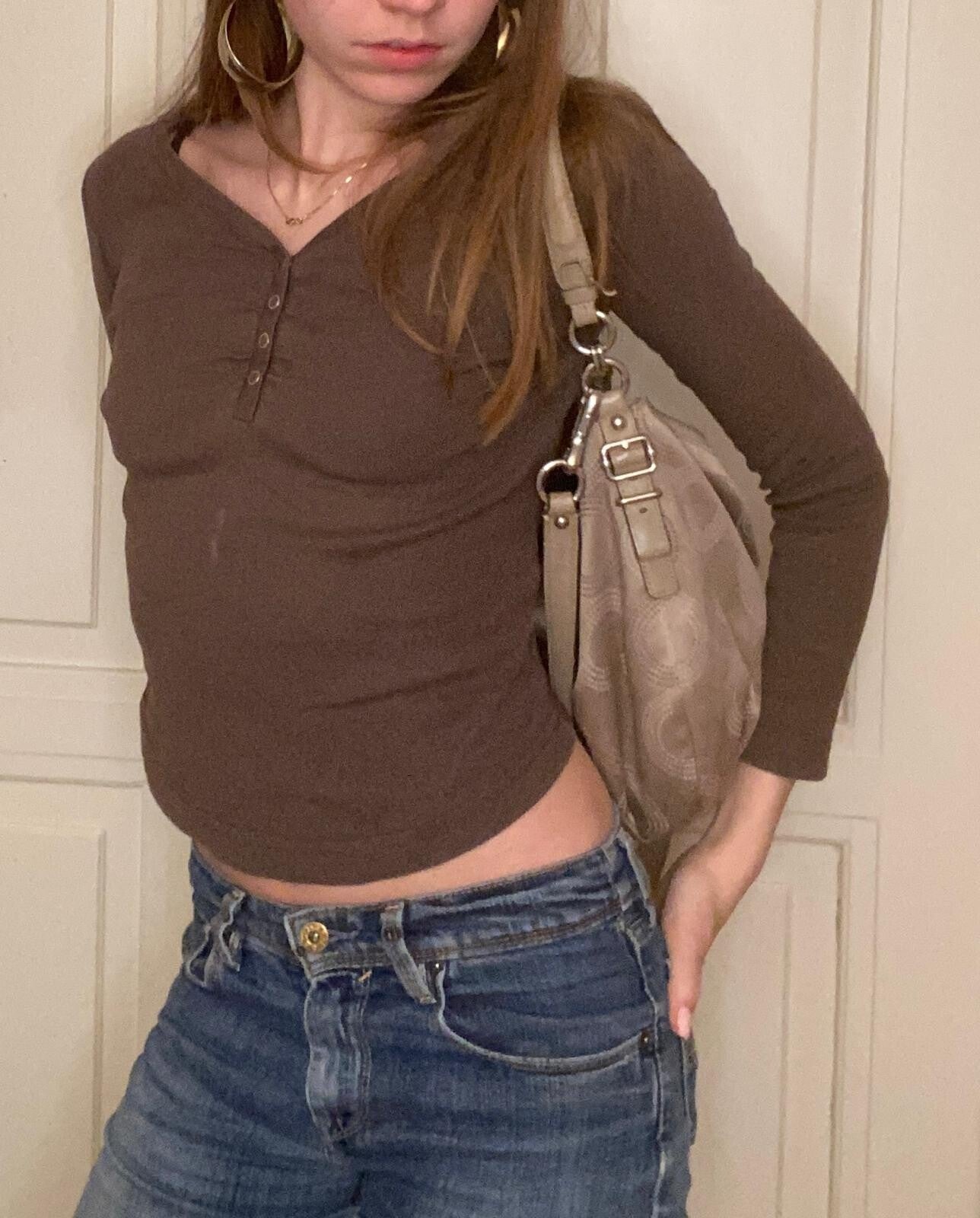 Brown longsleeve with buttons. In fair condition, has a slight stain on the front (see pictures). Bought on a flea market in Switzerland.