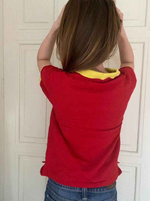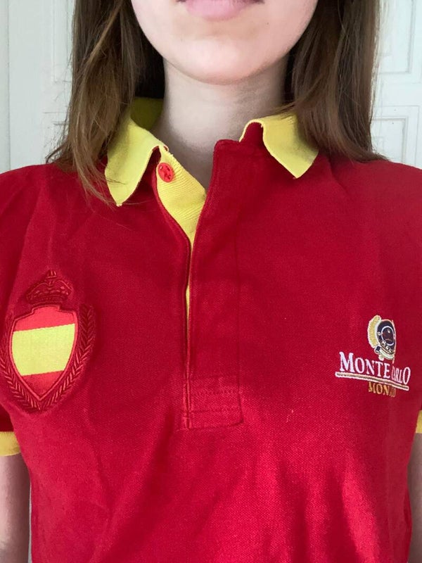 Red and yellow Poloshirt with "Monte Calro Monaco" print and press studs from "NATH". In good condition but already worn a bit and the color from the pront is starting to come off. Bought on a flea market in Switzerland.